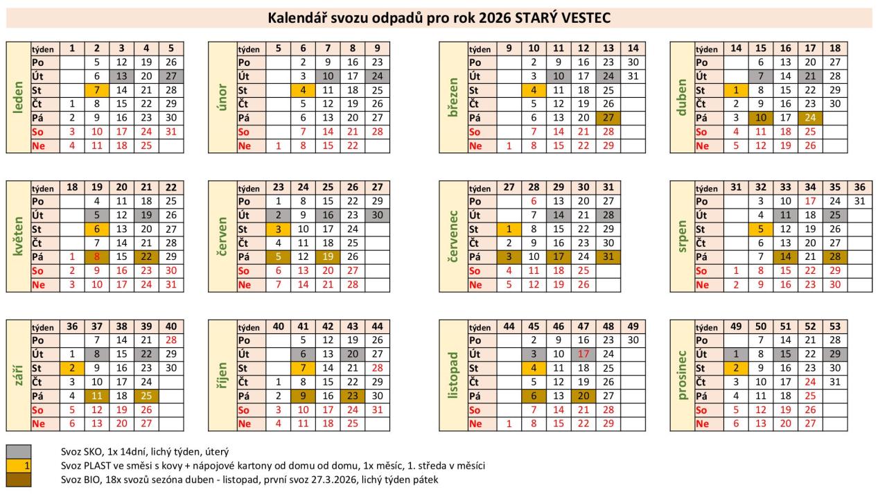 Sazba poplatku za odvoz SKO ( pro rok 2026 zůstává stejná ) činí 840,- Kč za svoz ve 14denním intervalu, celkem 26 svozů za rok, v úterý v lichém týdnu. První svoz v roce 2026 bude 13.1.